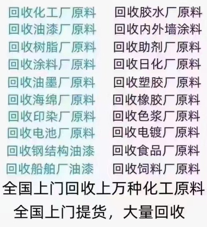 從事化工產(chǎn)品收購(gòu)、回收及銷售于一體的企業(yè),全國(guó)各大城市皆有辦事處,和全國(guó)多個(gè)單位,合資單位簽訂有常年收購(gòu)合同,我公司用心服務(wù)每一位客戶,每一次收購(gòu)過(guò)程的質(zhì)量。我們將不斷秉承"一次合作互信,多次合作互利"的宗旨,期待同您的合作! 我公司全國(guó)各地上門回收,服務(wù)到位,數(shù)量不限,讓貴單位處理的安心,放心。另我公司鄭重承諾,中介必酬,歡迎來(lái)電!如果您有化工中的廢舊原料或者有倉(cāng)庫(kù)中儲(chǔ)存的化工原料染料需要處理,都可以直接聯(lián)系我們。