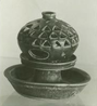德清窯黑瓷熏爐 高:15.6厘米,該器物由兩部分組成,爐身為小口,圓腹,腹上有小圓孔和三角形孔。爐座為雙層托盤,淺腹大平底,底有一大孔。釉色醬黑,造型簡(jiǎn)潔而穩(wěn)重,達(dá)到了實(shí)用和美觀的有機(jī)結(jié)合。