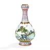 本瓶極其珍罕,屬于孤例,制于乾隆景德鎮(zhèn)御窯。該時期之洋彩瓷器極鮮見于市場,大部份藏于臺北國立故宮博物院及世界各地其它博物館。如此珍品現(xiàn)身拍場,必見藏家爭相追捧:今年四月,香港蘇富比上拍一件粉紅地琺瑯彩盌,以2.39億港元(約2,170萬英鎊)成交。