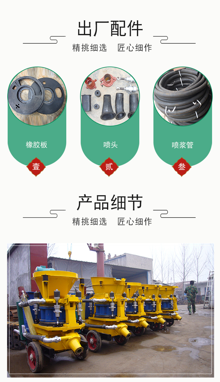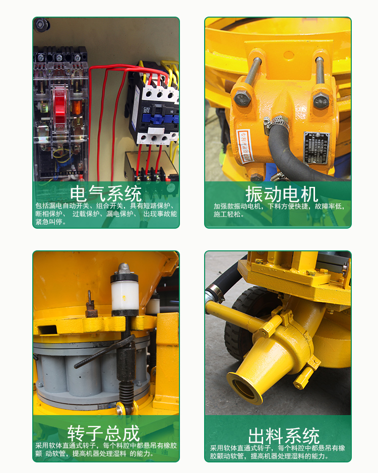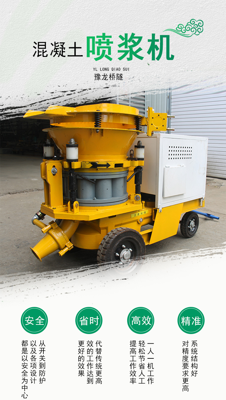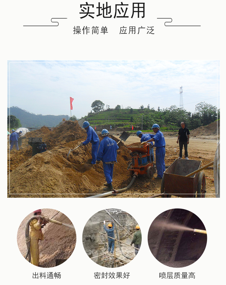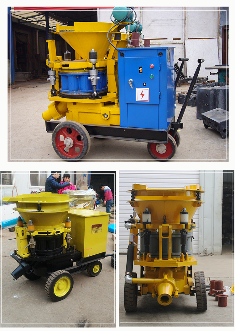 直通轉(zhuǎn)子式不粘結(jié)料腔,出料通暢,省時(shí):四點(diǎn)彈性補(bǔ)償壓緊,密封效果好,機(jī)旁粉塵少,易損件壽命長(zhǎng):采用低壓高速渦旋氣流輸送,克服物料輸送中粘結(jié),堵管和脈沖離折等問題,料流均勻,連續(xù)穩(wěn)定:新型噴頭,出料彎頭裝置,改善噴敷效果,回彈少,噴層質(zhì)量高。機(jī)器底盤可以裝配成輪胎式、滑撬式和各種軌距的軌輪式。
