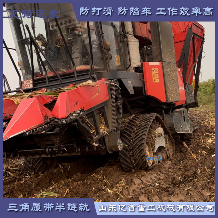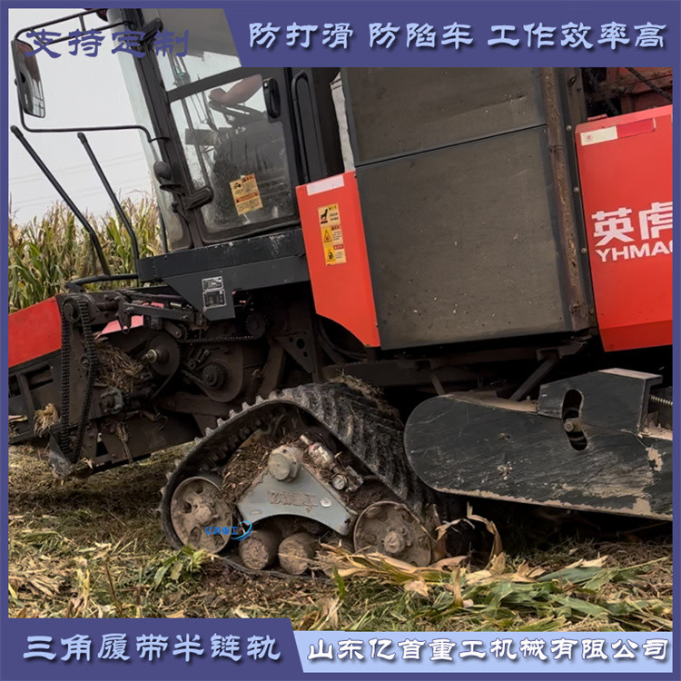 半鏈軌改裝的出現(xiàn),成功了這一難題。以山東億首重工機械有限公司生產的相關改裝產品為例。該半鏈軌采用三角履帶輪、防陷半鏈軌總成以及橡膠履帶半鏈軌總成等精妙設計。三角履帶輪通過特的結構布局,大大增加了與地面的接觸面積,分散了收割機的重量,降低了接地比壓。這使得收割機在松軟地面上行駛時,就如同給機器穿上了一雙寬大的 “鞋子”,能夠穩(wěn)穩(wěn)地站立在泥地之上,避免了下陷的風險。