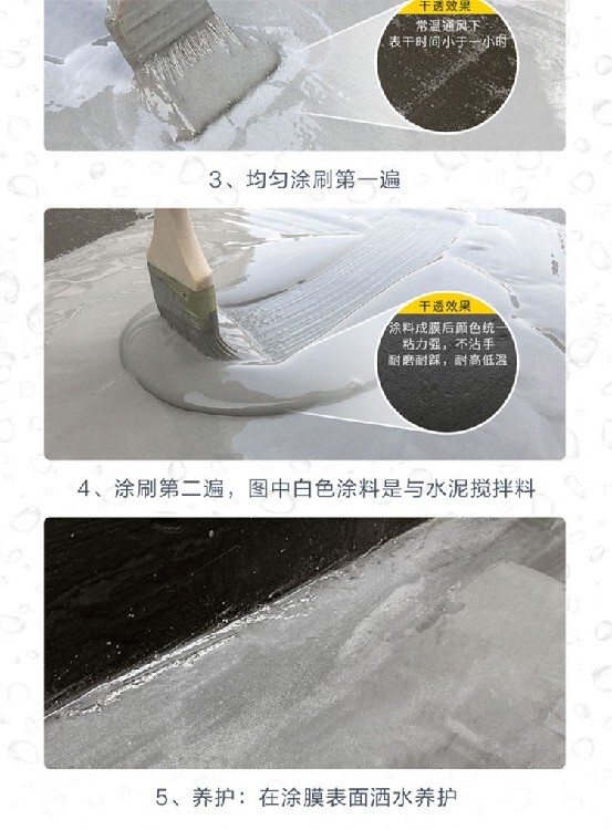 2.與基材粘結強:與水泥按照一定的比例混合后,可在潮濕的基面上施工,實干后與基體形成一個防水整體,而不會產(chǎn)生空鼓、脫落、竄水等現(xiàn)象。