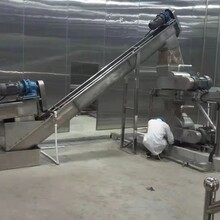 清洗后的馬鈴薯再通過傾斜帶式輸送機(jī)輸送到暫存料斗中,該料斗可貯存約50立方的馬鈴薯原料。特殊設(shè)計(jì)的出料口與可無級(jí)調(diào)速的卸料螺旋相連,因此可以通過此螺旋調(diào)整生產(chǎn)線的生產(chǎn)能力。原料通過輸送螺旋的出口進(jìn)入銼磨機(jī)進(jìn)行破碎。