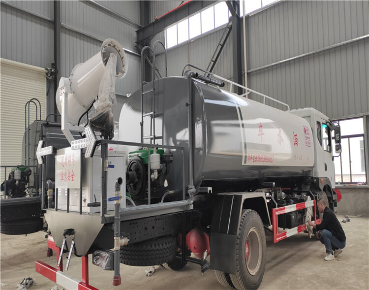 抑塵車可調直沖狀,大雨,中雨,毛毛雨,可連續(xù)調節(jié),大射程可達28米,垂直吸程8米,灑水車寬度14米,另加裝率車載式風送噴霧機,噴藥炮霧化效果好,可遠程噴霧,水平射程可達25米,帶消防接口,自流閥,可自吸自排。罐體采用4mm厚碳鋼板制作,罐體容積10噸,配備大功率灑水泵??沙樗驈南浪ㄉ线B接注水。罐體前部安裝大功率柴油發(fā)電機組,后置25-50米大型霧炮噴霧機組。