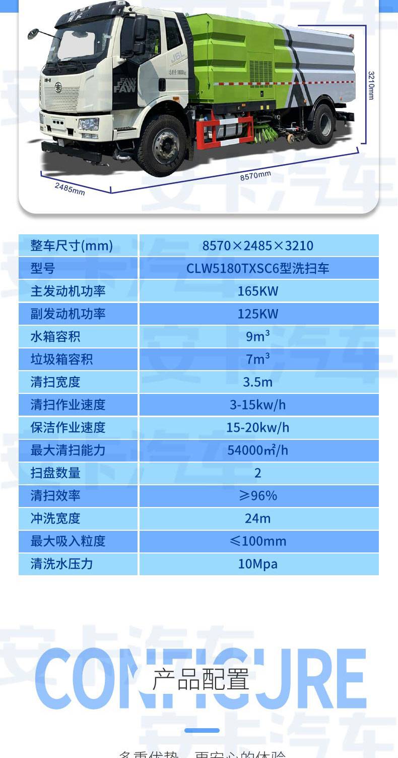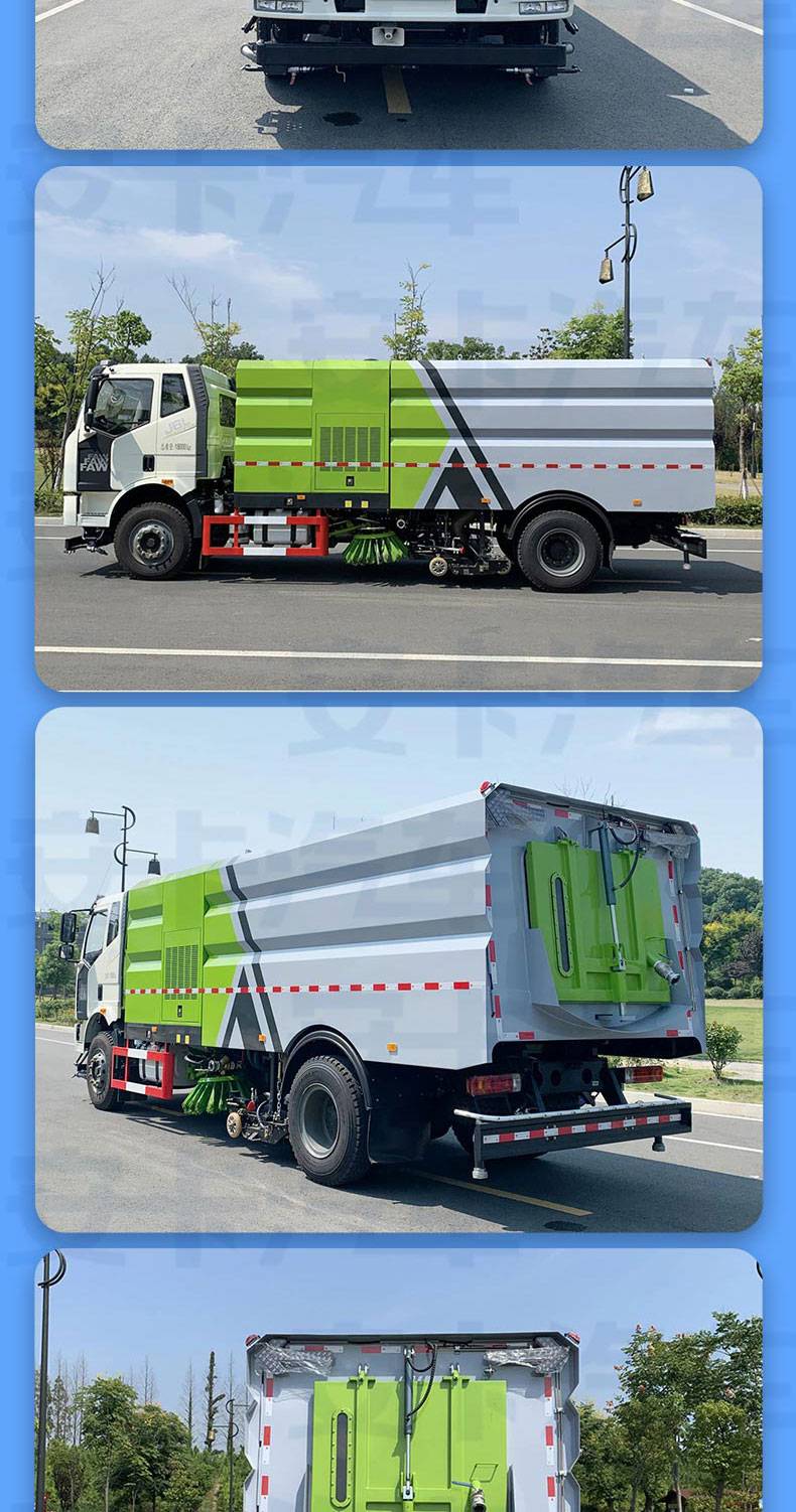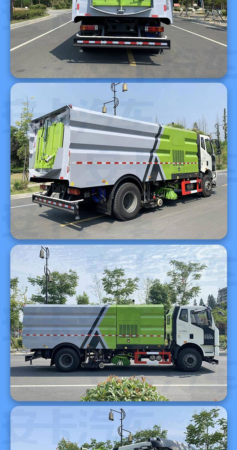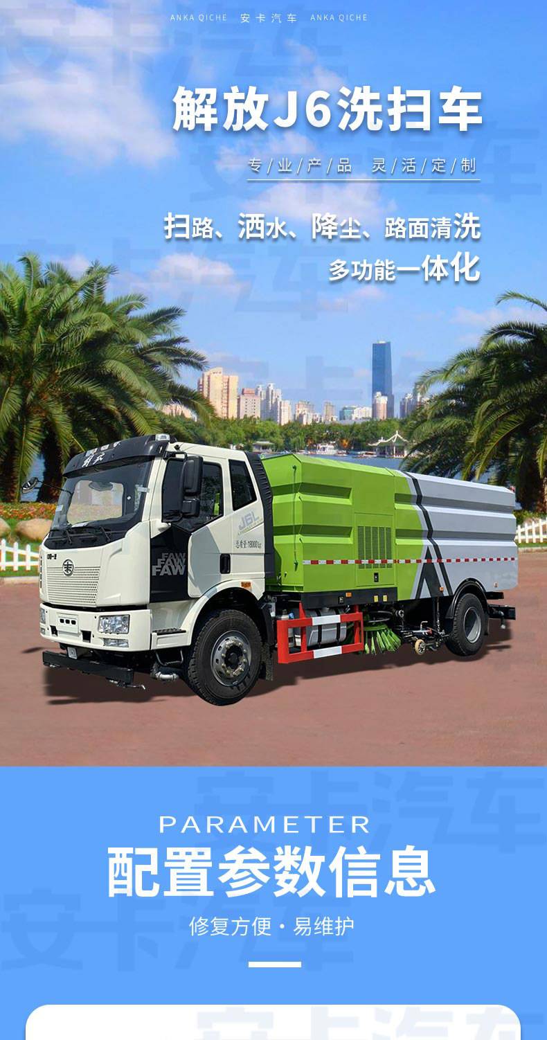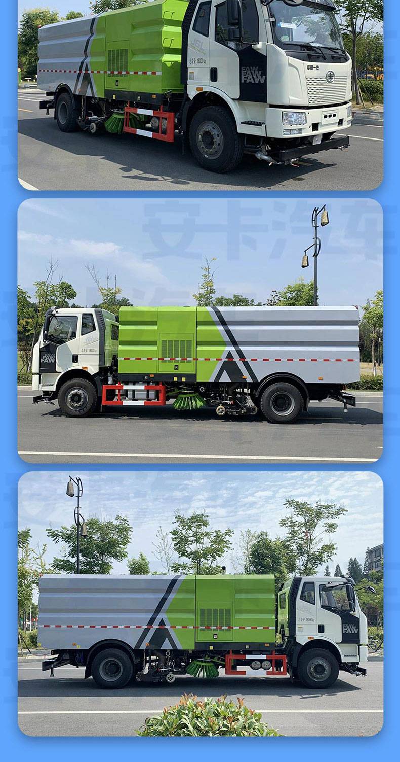 解放J6洗掃車結(jié)合了掃路車和高壓清洗車的功能,一般標配兩個中置掃刷,中置超寬吸嘴(內(nèi)置高壓噴水桿)。洗掃車在作業(yè)時由高壓噴水桿噴出高壓水流,可沖起路面頑固附著物,由吸嘴連同水和垃圾一起吸進垃圾箱。由于洗掃車在作業(yè)過程中耗水量較大,所以水箱比較大,因此洗掃車都由軸距在3800以上底盤改裝而成。