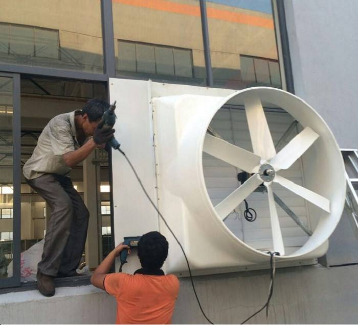 3、固定負壓風機:把做好的安裝支架固定在欲安裝負壓風機位置底部實體墻上后,兩人以上將負壓風機抬放到安裝支架上,用自攻螺絲將支架和負壓風機底部進行固定鎖死,負壓風機的四周用角鐵逐一去固定,原則是負壓風機固定安裝完畢后,用100公斤左右的力量去搖晃,只要不出現(xiàn)晃動,松動,脫落就算固定安裝完畢。