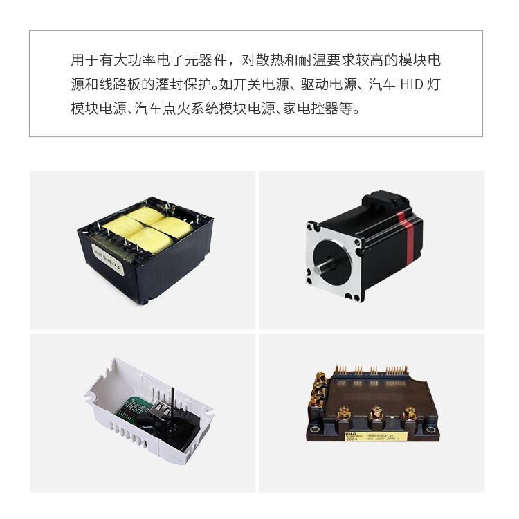 應用范圍,電池組,電子器件、模塊組件、驅動電源、線路板密封、繼電器、精密/敏感電子器件變壓器、整流電路,電感線圈,傳感器,電源適配器,電容器、傳感器、變壓器、等產(chǎn)品的灌封保護,環(huán)保 阻燃 絕緣 防水 導熱 耐高低溫 流動性好 自流平