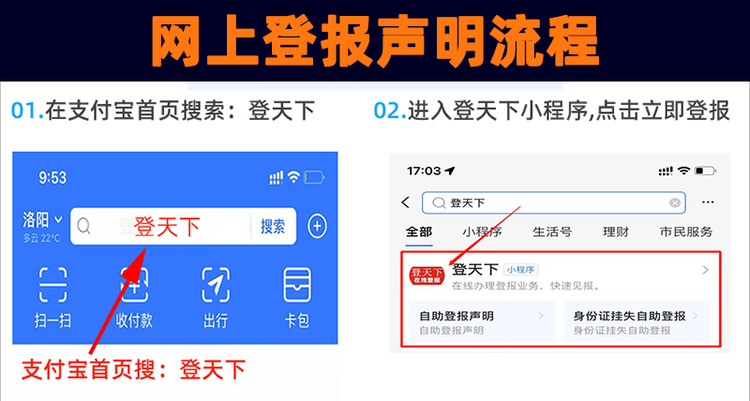 網(wǎng)上掛失登報的具體操作方式,可以在相關(guān)的平臺上進行操作,流程如下:在小程序或者支付寶首頁搜:登天下,進入登天下小程序后,就可以辦理掛失登報