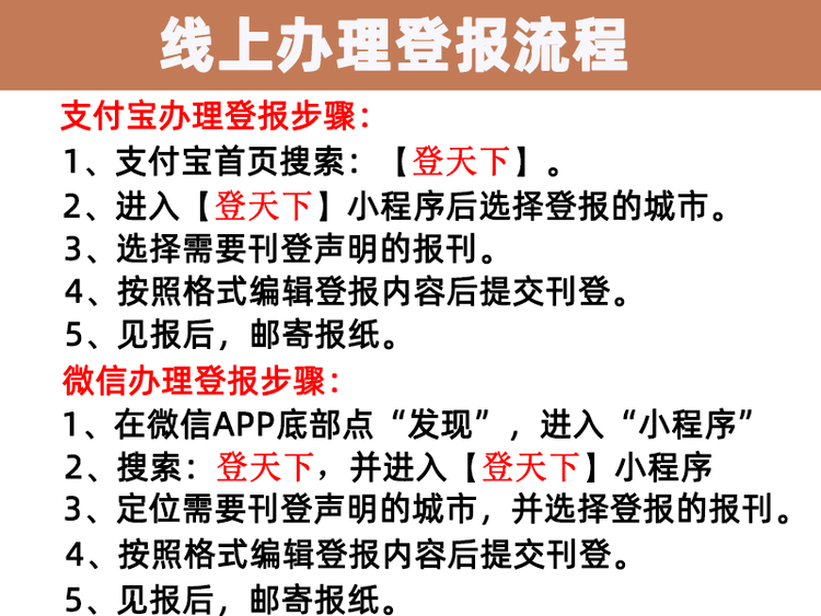 網(wǎng)絡(luò)平臺辦理:現(xiàn)在一些登報辦理平臺可以提供在線登報服務(wù),當(dāng)事人可以在網(wǎng)上提交公告內(nèi)容,進(jìn)行審核并支付費用,相對來說較為方便。網(wǎng)絡(luò)平臺辦理登報公告以“登天下”為例,流程如下: