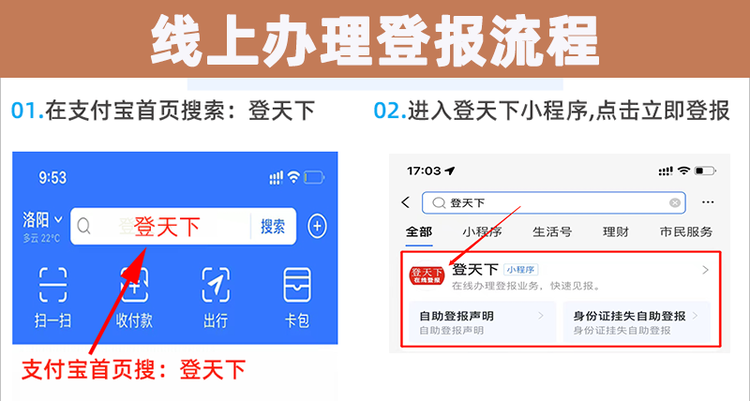 網(wǎng)上掛失登報的具體操作方式,可以在相關(guān)的平臺上進(jìn)行操作,流程如下:在小程序或者支付寶首頁搜:登天下,進(jìn)入登天下小程序后,就可以辦理掛失登報
