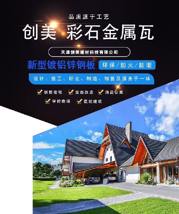 創(chuàng)美彩石金屬瓦專注于國際新型屋面材料的研發(fā)、推廣、制造、施工 創(chuàng)美彩石金屬瓦是一家生產、銷售、安裝、施工的工廠企業(yè),我們?yōu)槠礁钠?、學校、別墅、旅游景區(qū)等工程項目及個人自建房屋用戶提供的彩石金屬瓦。 創(chuàng)美彩石金屬瓦產品質量符合歐美標準、擁有多項發(fā)明專利、目前有12種瓦型和16種常規(guī)顏色、產品使用壽命可長達50年、讓產品更好的適應消費者不斷提升的實用和審美需求。
