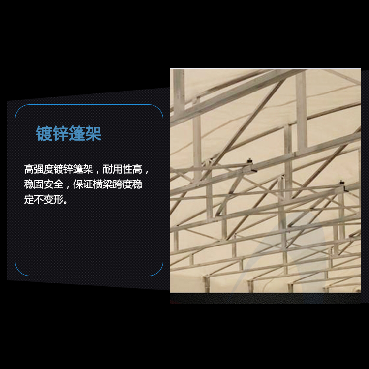 6、印刷:可根據(jù)客戶提供logo圖稿印刷;用 途:品質(zhì)優(yōu)良,在強(qiáng)烈陽光下不會(huì)脫色,跨度可做到15m中間不用加柱子,適用于工廠臨時(shí)倉庫,大排檔,物流出貨,大型活動(dòng)場所帳篷廠等起到非常好的遮陽、擋雨、裝飾的效果。