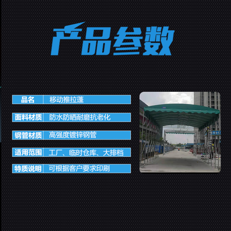 3.規(guī)格:可根據(jù)客戶實(shí)際需求尺寸定做。產(chǎn)品特點(diǎn):推拉篷是較靈活的一種產(chǎn)品,它既可以隨時(shí)的跟換地方,又穩(wěn)固美觀大方,針對(duì)不同類型的場地可搭建,靈活運(yùn)用各種場所。具有拆裝便捷、運(yùn)輸方便、組合多樣化等特點(diǎn)。推拉蓬內(nèi)空無任何多余梁柱,空間使用率達(dá)百分之100。