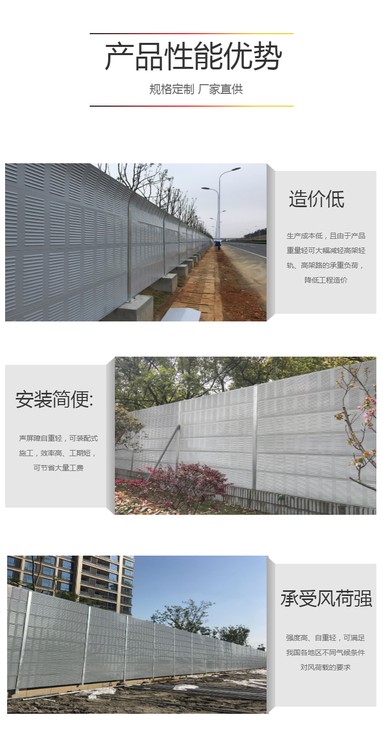 工廠聲屏障外形美觀大方,制作,運(yùn)輸、安裝方便,造價(jià)低,使用壽命長(zhǎng),特別適用于工廠的防噪聲使用,是現(xiàn)代化城市理想的隔聲降噪設(shè)施。