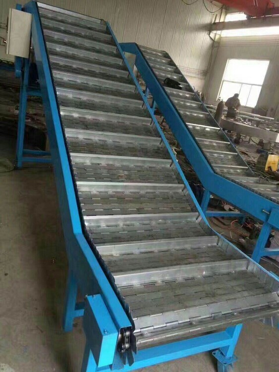 鏈板輸送機是一種以標準鏈板為承載面,由馬達減速機為動力傳動的傳送裝置。鏈板式輸送機,由動力裝置(電機)、傳動軸、滾筒、張緊裝置、鏈輪、鏈條、軸承、潤滑劑、鏈板等等構(gòu)成。其中帶動物料的輸送的主要的兩個部分為:鏈條,利用它的循環(huán)往復(fù)運動提供牽引動力;金屬板,作為輸送過程中的承載體。