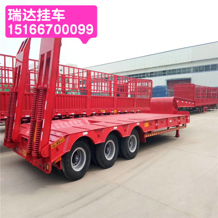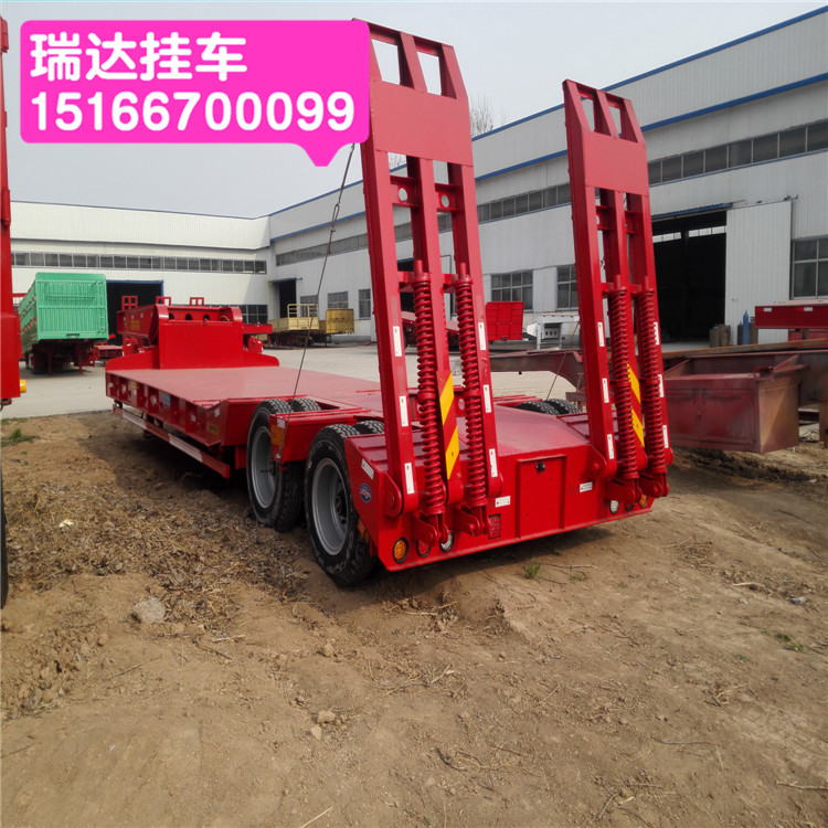 山東梁山瑞達掛車有限公司 【低平板半掛車】車載部位無欄板,用途廣泛,主要用于中長途貨運運輸。系列半掛車車架為穿梁式結(jié)構(gòu),縱梁采用平直式活鵝頸式。腹板高度從400mm至550mm,縱梁采用自動埋弧焊焊接,車架采用噴丸處理,橫梁穿入縱梁并焊接整體。串聯(lián)式干板彈簧和懸掛支座組成,結(jié)構(gòu)合理,具有較強的剛性和強度,用來支承載荷緩沖擊。低平板半掛車通常用來運輸重型汽車(如牽引車、大客車、汽車等)、軌道車輛、礦用機器林業(yè)機器、農(nóng)業(yè)機器(如挖掘機、推土機、裝載機、鋪路機、起重機等)及其他重載貨物,其重心越低,穩(wěn)定性和安全性越好,運輸貨物和通過頭頂障礙的能力就越強。低平板半掛車結(jié)構(gòu)和裝載 低平板半掛車通常采用凹梁式(或者井型)車架,既車架前段為鵝頸(鵝頸前段的牽引銷與牽引車上的牽引鞍座相連,鵝頸后端與半掛車架相連),中段為貨臺(車架低部分),后端為輪架(含車輪)。在往低平板半掛車上裝載機械設(shè)備時,通常是從半掛車后端裝載機械設(shè)備,即采用從后輪架上 面移動機械設(shè)備或者將車輪移除的方式, 然后再將機械設(shè)備固定在半掛車上。低平板式半掛車行走結(jié)構(gòu)使用高強度國際鋼材質(zhì),整車自重輕,并保障其抗扭曲、抗震、抗顛簸能力、滿足不同的路面承載能力。我們始終堅持、位、重合同、守信用、產(chǎn)品實行“三包”、供貨及時、服務(wù)周到的經(jīng)營宗旨。每發(fā)展一步,想到的是客戶,我們靠質(zhì)量求生存,以信譽求發(fā)展。13米挖掘機拖板車系列價格 公告 尺寸 圖片