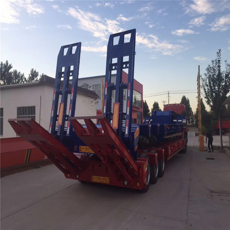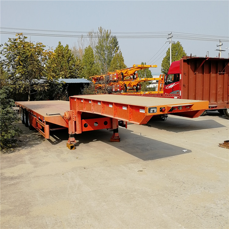 低平板半掛車通常用來(lái)運(yùn)輸重型汽車(如牽引車、大客車、汽車等)、軌道車輛、礦用機(jī)器、林業(yè)機(jī)器、農(nóng)業(yè)機(jī)器(如挖掘機(jī)、推土機(jī)、裝載機(jī)、鋪路機(jī)、起重機(jī)等)及其他重載貨物,其重心越低,穩(wěn)定性和安全性越好,運(yùn)輸貨物和通過(guò)頭頂障礙的能力就越強(qiáng)。低平板半掛車結(jié)構(gòu)和裝載。低平板半掛車通常采用凹梁式(或者井型)車架,既車架前段為鵝頸(鵝頸前段的牽引銷與牽引車上的牽引鞍座相連,鵝頸后端與半掛車架相連),中段為貨臺(tái)(車架低部分),后端為輪架(含車輪)。在往低平板半掛車上裝載機(jī)械設(shè)備時(shí),通常是從半掛車后端裝載機(jī)械設(shè)備,即采用從后輪架上 面移動(dòng)機(jī)械設(shè)備或者將車輪移除的方式, 然后再將機(jī)械設(shè)備固定在半掛車上。