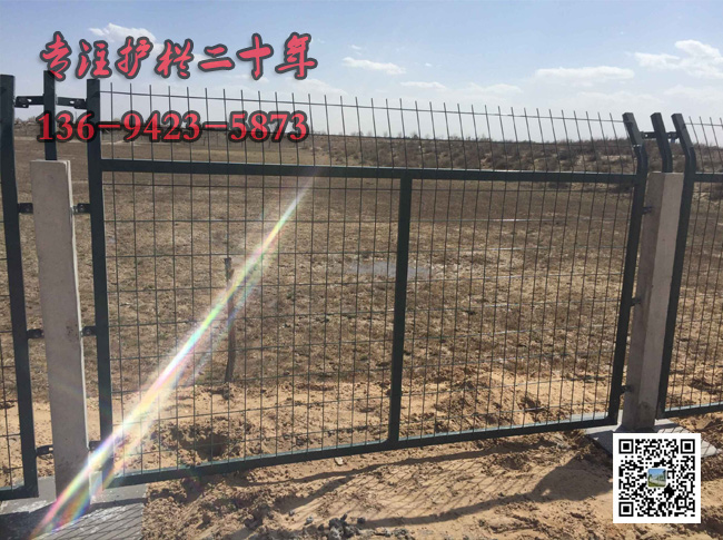 鋼筋混凝土立柱金屬網(wǎng)片防護(hù)柵欄可采用單開門或雙開門兩種形式。單開寬度1.5m,雙開寬度3m,其網(wǎng)片形式與防護(hù)柵欄保持一致,并通過銷鈾、銷鈾套與立柱連接。