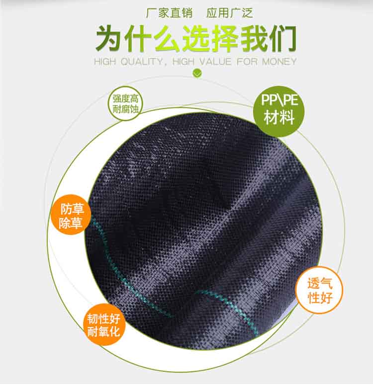 防止陽(yáng)光透過(guò)地面防草布照射到下面的雜草,使雜草不能進(jìn)行光合作用,達(dá)到防止雜草生長(zhǎng)的作用,同時(shí)能夠抗紫外線和抗霉變,具有一定的強(qiáng)度和耐磨性,既能阻止植物根系鉆出地面,美化環(huán)境,提高勞動(dòng)效率和經(jīng)濟(jì)效益,防治污染環(huán)境,減少農(nóng)藥的使用量,還能夠阻止昆蟲(chóng)和小型動(dòng)物的侵害和生長(zhǎng),由于這種地面防草布的透氣性好,滲水快,使的植物根部的吸收水分能力得到提高,有益于植物的生長(zhǎng),防止了根部腐爛,單相線標(biāo)志的設(shè)置,使的在溫室內(nèi)或室外擺放花盆或安排栽培基質(zhì)時(shí),可根據(jù)標(biāo)志線來(lái)準(zhǔn)確進(jìn)行安排,提高勞動(dòng)效率。